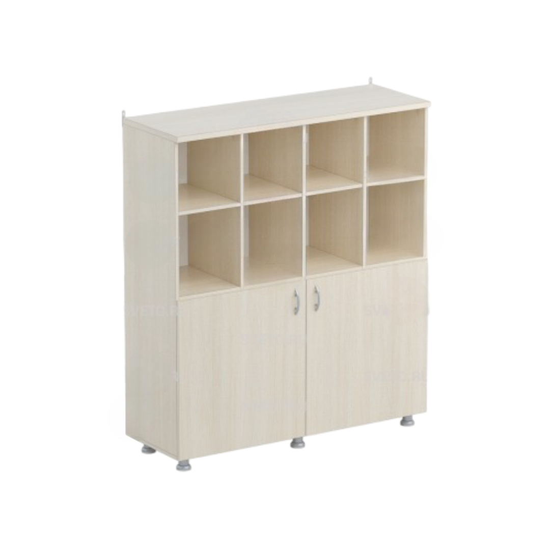 Выполнен из ламинированной ДСП 16 мм, верхняя крышка 25 мм, торцы обрамлены кромкой ПВХ в тон ЛДСП. Конструкцией шкафа предусмотрены две секции, верхняя открытая, имеет 8 ячеек, нижняя секция - 8 ячеек, закрыты двумя дверками. Шкаф снабжен регулируемыми опорами, позволяющими компенсировать неровности пола.